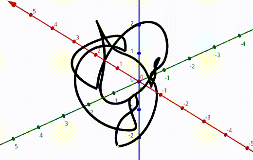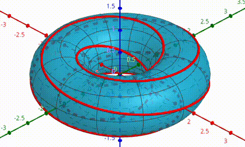 This page is mostly an excuse to show off something cool I made during my summer working with Ben Williams that wouldn’t show up in the paper. At one point during the summer, I was studying how the symmetries of knot 9-48 act on its corresponding fundamental group. Generally the way you do this is quite geometric, just draw out the generating loops of the fundamental group and see where they end up under the symmetric transformation. The issue is that this doesn’t work with knot 9-48, as there are no symmetries of the knot that can be seen in R^3 alone. We instead need to work with R^3 with an added point at infinity, and symmetries that look like this.